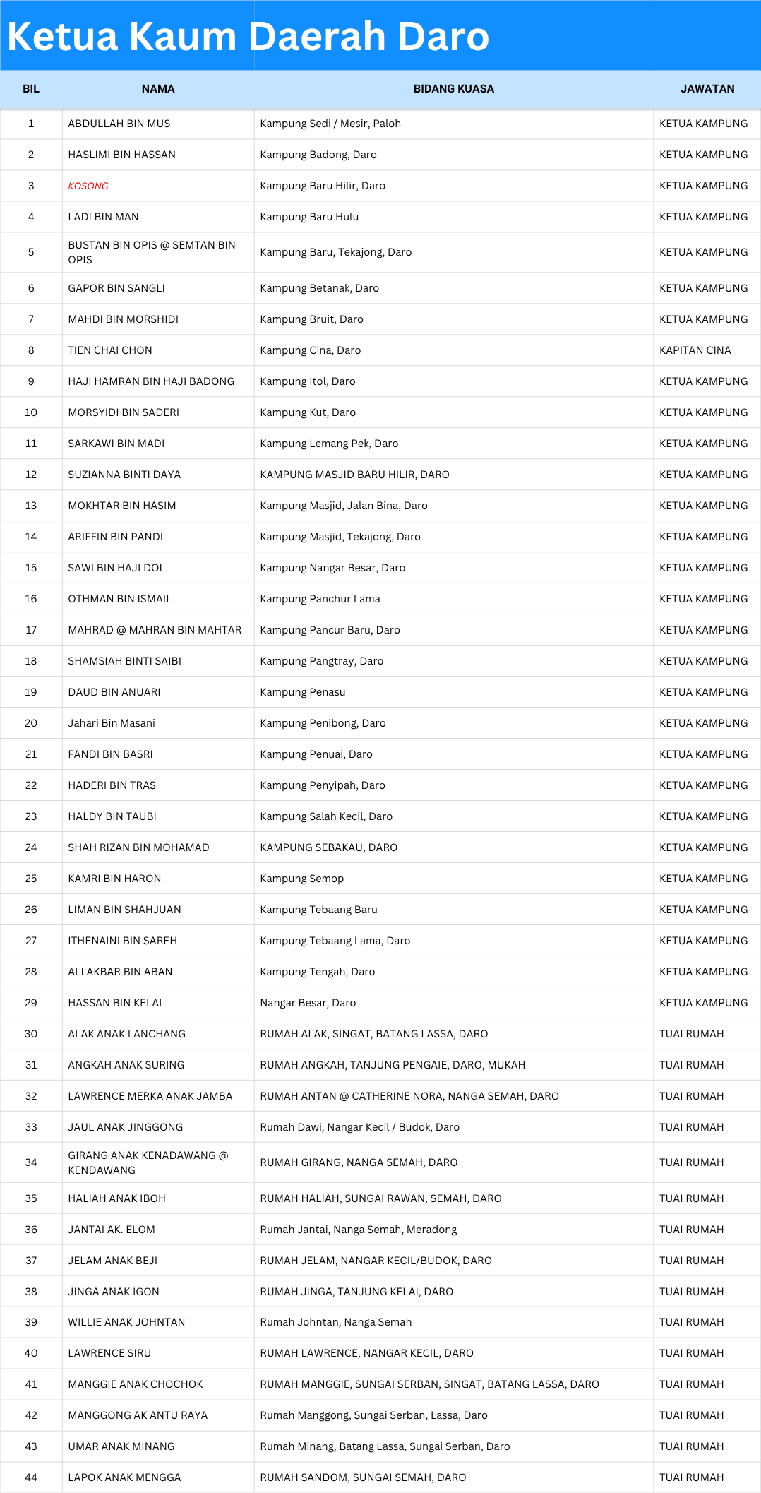 Senarai Ketua Masyarakat dan Ketua Kaum Daerah Daro